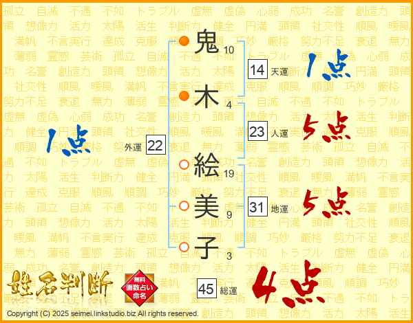 鬼(10画)木(4画) 絵(19画)美(9画)子(3画)