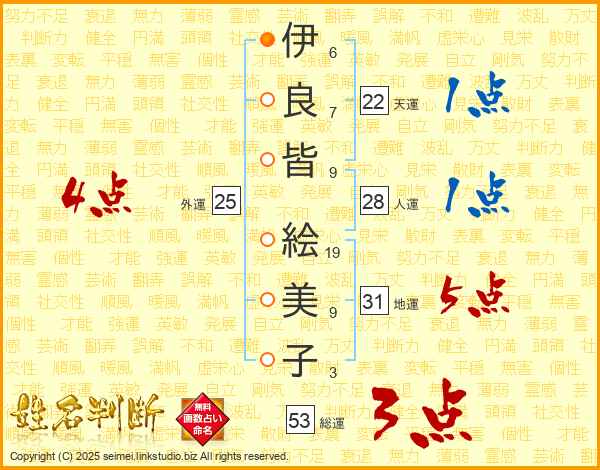 伊(6画)良(7画)皆(9画)  絵(19画)美(9画)子(3画)