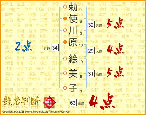 勅使川原絵美子さんの総運は63画の4点!