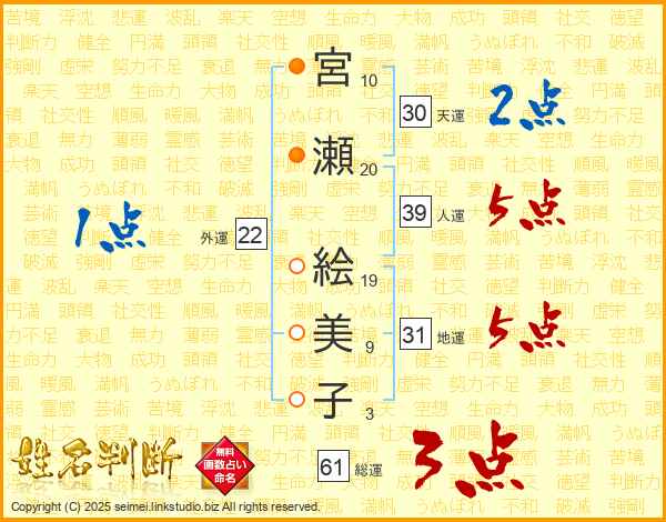 宮瀬絵美子さんの人運は39画の5点!