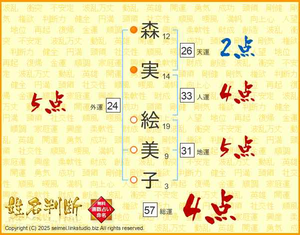 森(12画)実(14画) 絵(19画)美(9画)子(3画)