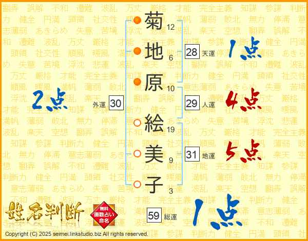 菊(12画)地(6画)原(10画) 絵(19画)美(9画)子(3画)