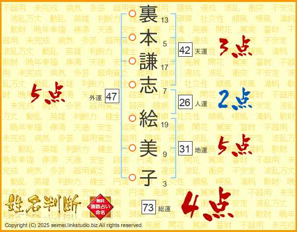 裏本謙志絵美子さんの総運は73画の4点!