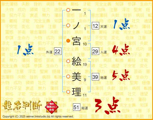 一(1画)ノ(1画)宮(10画) 絵(19画)美(9画)理(11画)