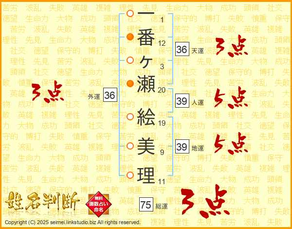 一番ヶ瀬絵美理さんの人運は39画の5点!