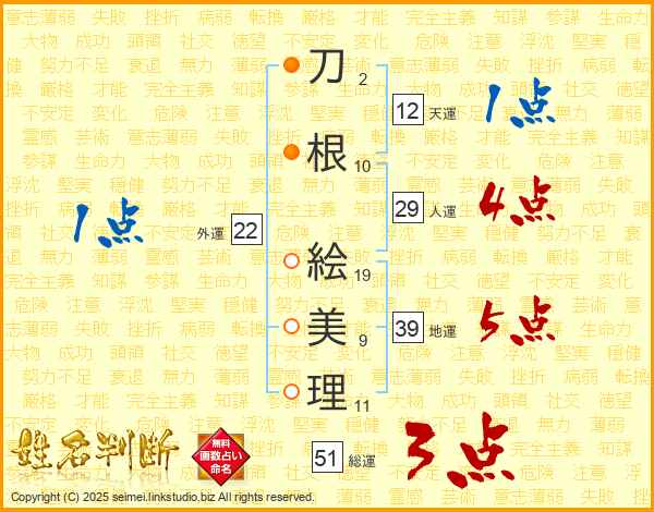 刀(2画)根(10画) 絵(19画)美(9画)理(11画)