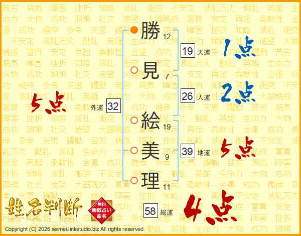 勝(12画)見(7画) 絵(19画)美(9画)理(11画)
