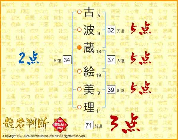 古(5画)波(9画)蔵(18画) 絵(19画)美(9画)理(11画)