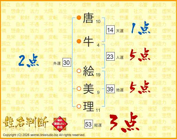 唐(10画)牛(4画) 絵(19画)美(9画)理(11画)
