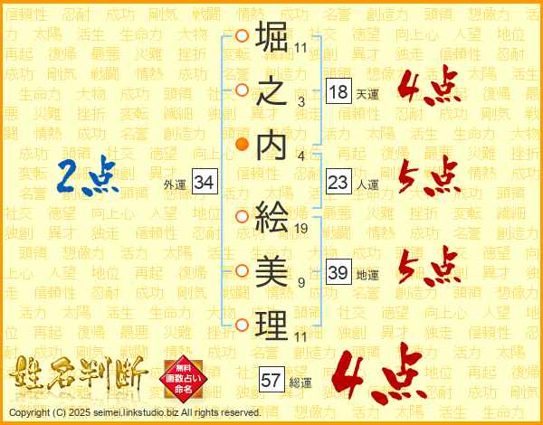 堀(11画)之(3画)内(4画) 絵(19画)美(9画)理(11画)