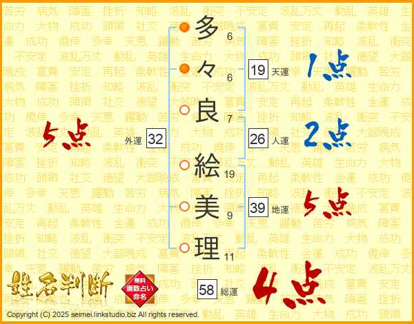 多(6画)々(6画)良(7画) 絵(19画)美(9画)理(11画)