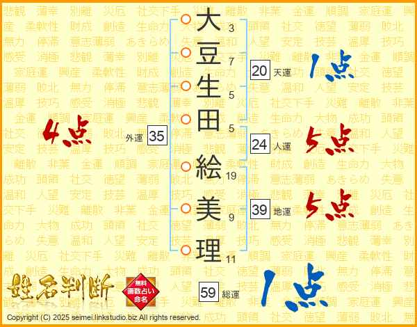 大(3画)豆(7画)生(5画)田(5画) 絵(19画)美(9画)理(11画)