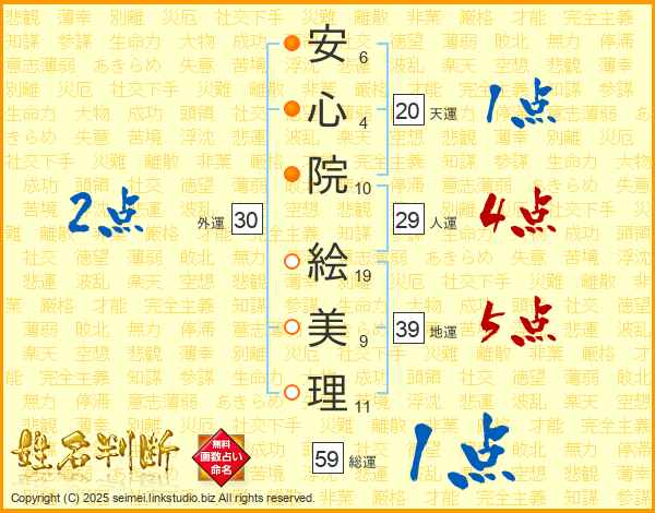 安(6画)心(4画)院(10画) 絵(19画)美(9画)理(11画)