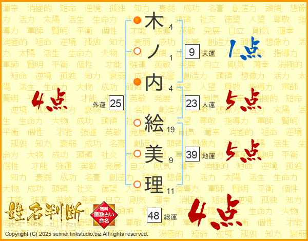 木(4画)ノ(1画)内(4画) 絵(19画)美(9画)理(11画)