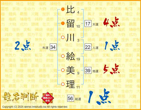 比(4画)留(10画)川(3画) 絵(19画)美(9画)理(11画)