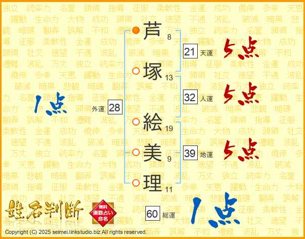 芦(8画)塚(13画) 絵(19画)美(9画)理(11画)