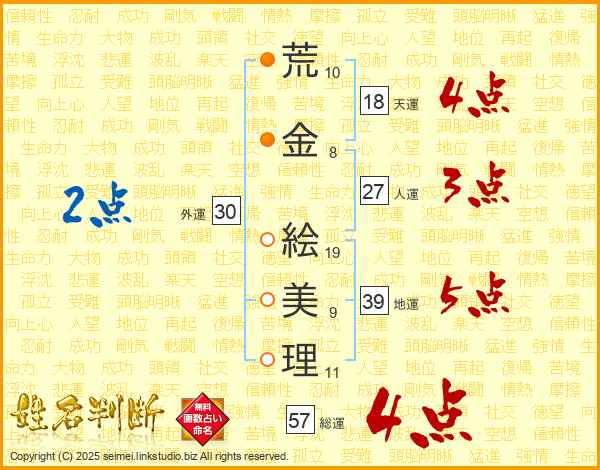 荒(10画)金(8画) 絵(19画)美(9画)理(11画)