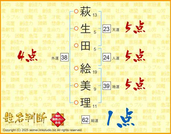 萩(13画)生(5画)田(5画) 絵(19画)美(9画)理(11画)