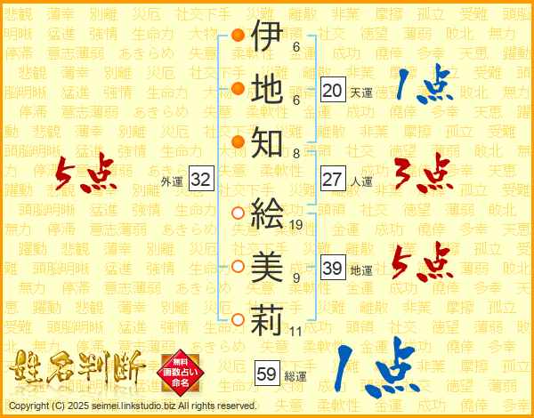 伊(6画)地(6画)知(8画) 絵(19画)美(9画)莉(11画)