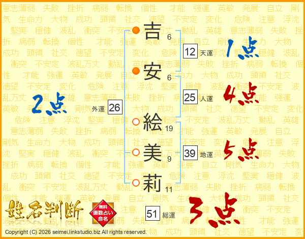 吉(6画)安(6画) 絵(19画)美(9画)莉(11画)