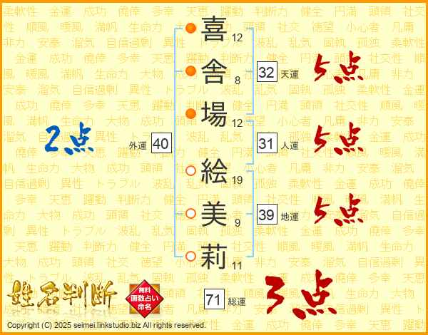 喜(12画)舎(8画)場(12画) 絵(19画)美(9画)莉(11画)