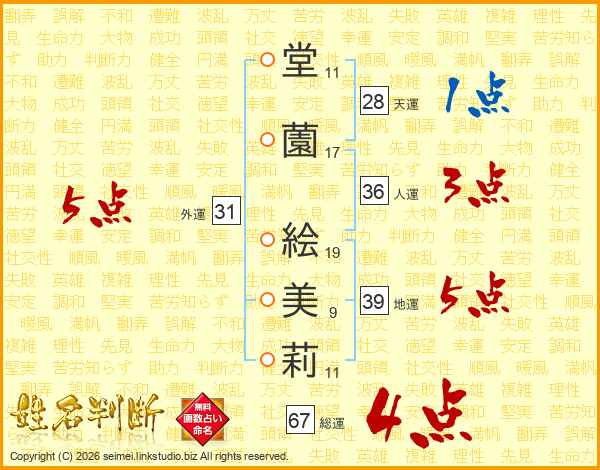 堂(11画)薗(17画) 絵(19画)美(9画)莉(11画)