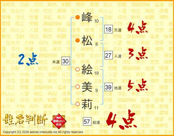 峰(10画)松(8画) 絵(19画)美(9画)莉(11画)