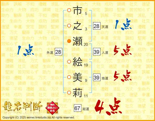 市(5画)之(3画)瀬(20画) 絵(19画)美(9画)莉(11画)