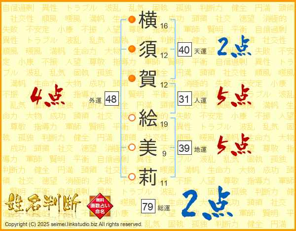 横(16画)須(12画)賀(12画) 絵(19画)美(9画)莉(11画)