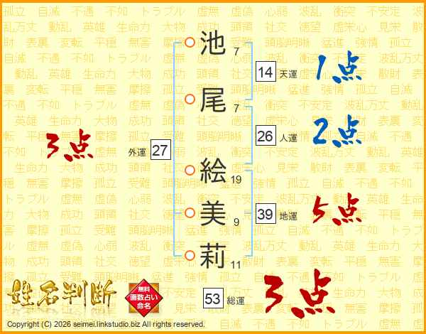 池(7画)尾(7画) 絵(19画)美(9画)莉(11画)