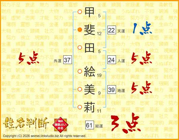 甲(5画)斐(12画)田(5画) 絵(19画)美(9画)莉(11画)