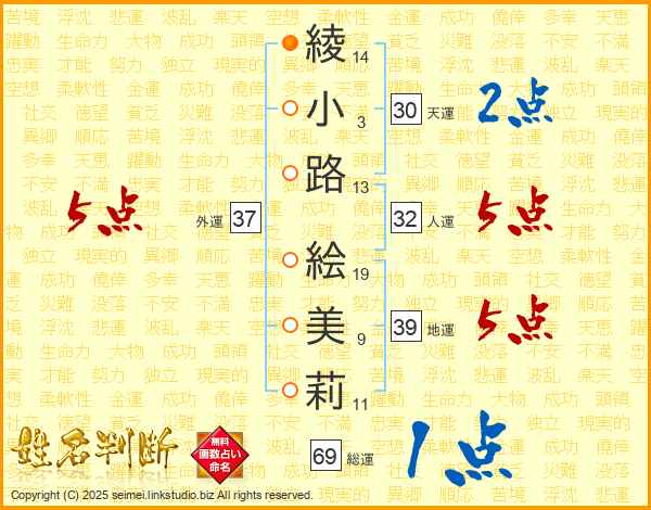 綾(14画)小(3画)路(13画) 絵(19画)美(9画)莉(11画)