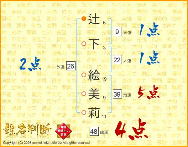 辻(6画)下(3画) 絵(19画)美(9画)莉(11画)