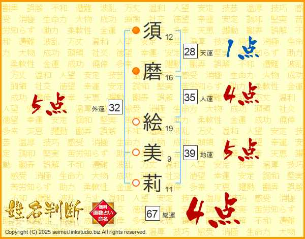 須(12画)磨(16画) 絵(19画)美(9画)莉(11画)