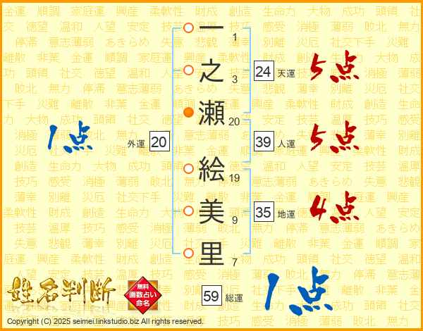 一之瀬絵美里さんの総運は59画の1点!