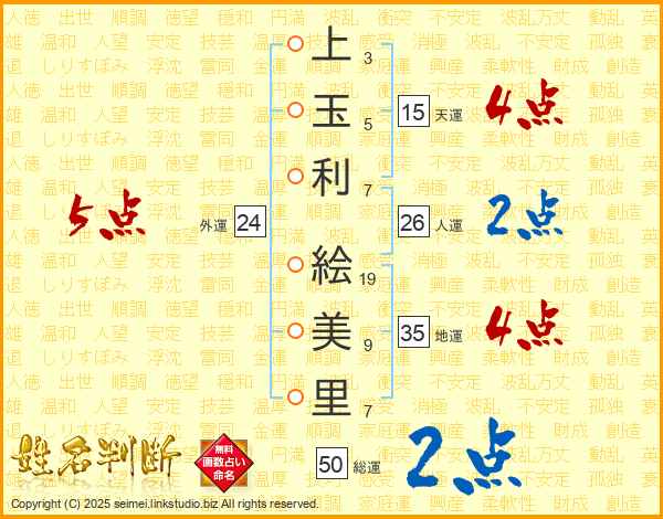 上(3画)玉(5画)利(7画) 絵(19画)美(9画)里(7画)