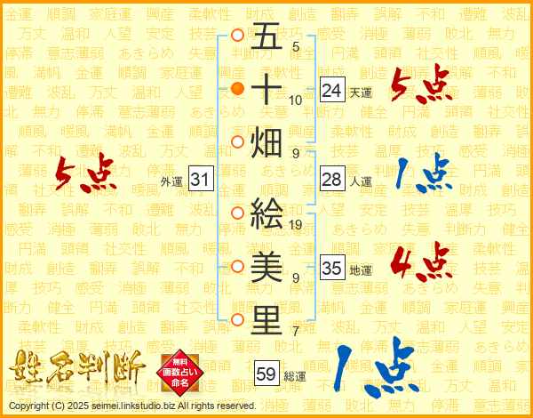 五(5画)十(10画)畑(9画) 絵(19画)美(9画)里(7画)