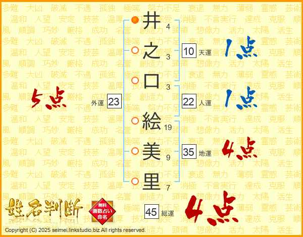 井(4画)之(3画)口(3画) 絵(19画)美(9画)里(7画)