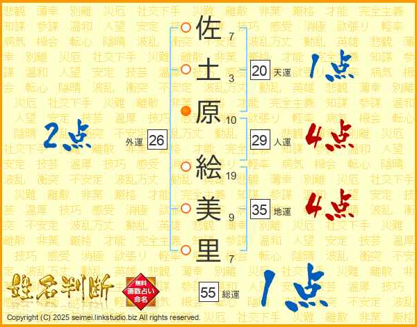 佐(7画)土(3画)原(10画) 絵(19画)美(9画)里(7画)