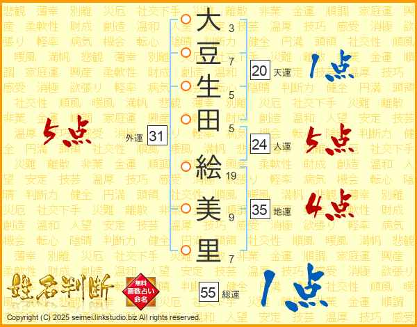 大(3画)豆(7画)生(5画)田(5画) 絵(19画)美(9画)里(7画)