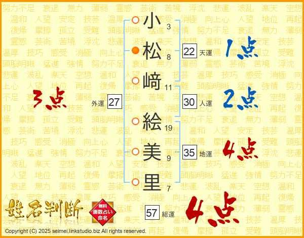 小(3画)松(8画)﨑(11画) 絵(19画)美(9画)里(7画)