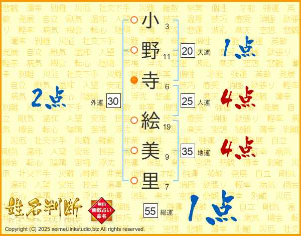 小(3画)野(11画)寺(6画) 絵(19画)美(9画)里(7画)