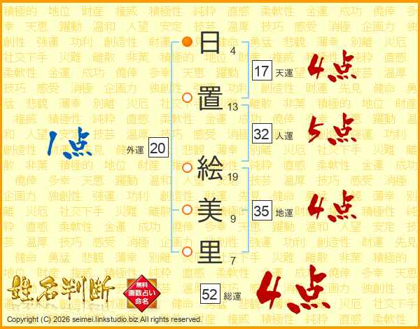 日(4画)置(13画) 絵(19画)美(9画)里(7画)