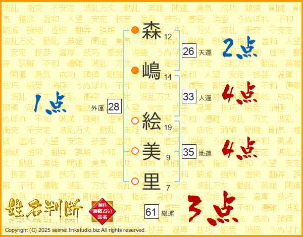 森(12画)嶋(14画) 絵(19画)美(9画)里(7画)