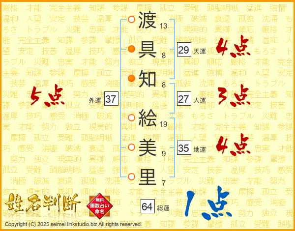 渡(13画)具(8画)知(8画) 絵(19画)美(9画)里(7画)
