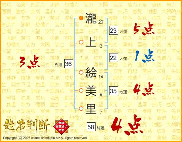 瀧(20画)上(3画) 絵(19画)美(9画)里(7画)