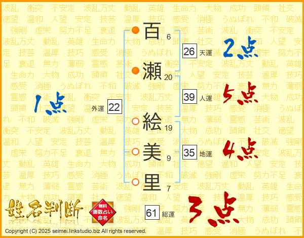 百瀬絵美里さんの人運は39画の5点!