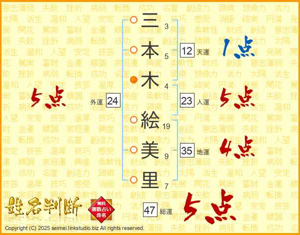三(3画)本(5画)木(4画) 絵(19画)美(9画)里(7画)