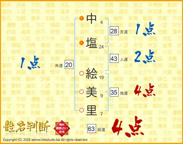 中(4画)塩(24画) 絵(19画)美(9画)里(7画)