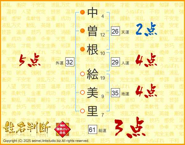 中(4画)曽(12画)根(10画) 絵(19画)美(9画)里(7画)